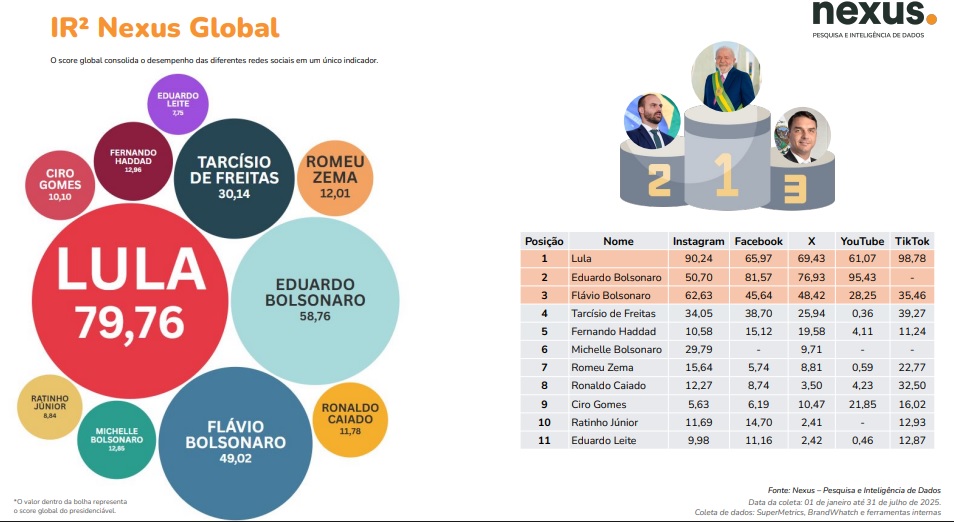 O presidente Lula (PT) apresentou o maior Índice de Relevância das Redes (IR² Nexus) ao longo de todo o ano de 2025. A análise da presença digital foi feita pela Nexus – Pesquisa e Inteligência de Dados, a partir da análise em metodologia proprietária dos 11 principais nomes cotados para a corrida eleitoral de outubro deste ano. Foram levadas em consideração as cinco principais redes sociais — Instagram, X, Facebook, YouTube e TikTok — entre os dias 1º de janeiro e 31 de dezembro de 2025. Os dados não incluem o ex-presidente Jair Bolsonaro, que está preso, proibido de utilizar redes sociais e inelegível por determinação do Tribunal Superior Eleitoral (TSE).