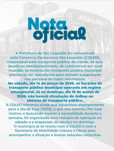 A prefeitura de São Leopoldo (gestão PL) anunciou em nota oficial que, devido a suposto “desabastecimento mundial de combustível”, o sistema operaria em regime emergencial no sábado (14/03/2026) e ficaria suspenso no domingo (15/03), para preservar estoques para a semana seguinte.