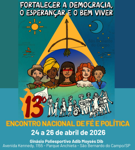 O 13º Encontro nacional do Movimento nacional Fé e Politica será de 24 a 26 de abril em São Bernardo do Campo, ABC, SP, com o tema FORTALECER A DEMOCRACIA, O ESPERANÇAR E O BEM VIVER.